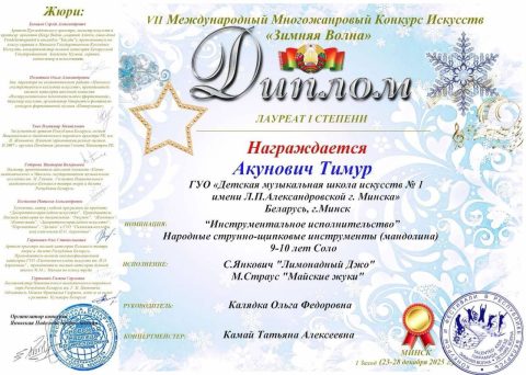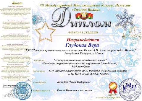С огромной гордостью поздравляем учащихся классов мандолины и баяна нашей школы — Тимура Акуновича и Веру Глубокую — ставших лауреатами I степени, Виталия Машовца — лауреата III степени на VII Международном многожанровом конкурсе искусств «Зимняя волна», который проходил в г. Минске (Республика Беларусь) с 23 по 28 декабря 2025 года.