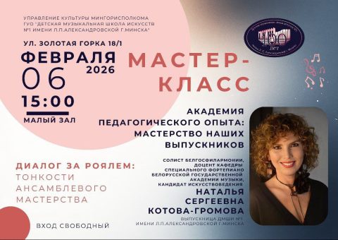 6 февраля 2026 года в Детской музыкальной школе искусств №1 имени Л.П.Александровской в рамках проекта «Академия педагогического опыта: мастерство наших выпускников», приуроченного к вековому юбилею школы, прошёл мастер-класс Натальи Сергеевны Котовой-Громовой -солистки Белгосфилармонии, кандидата искусствоведения, доцента Белорусской государственной академии музыки.